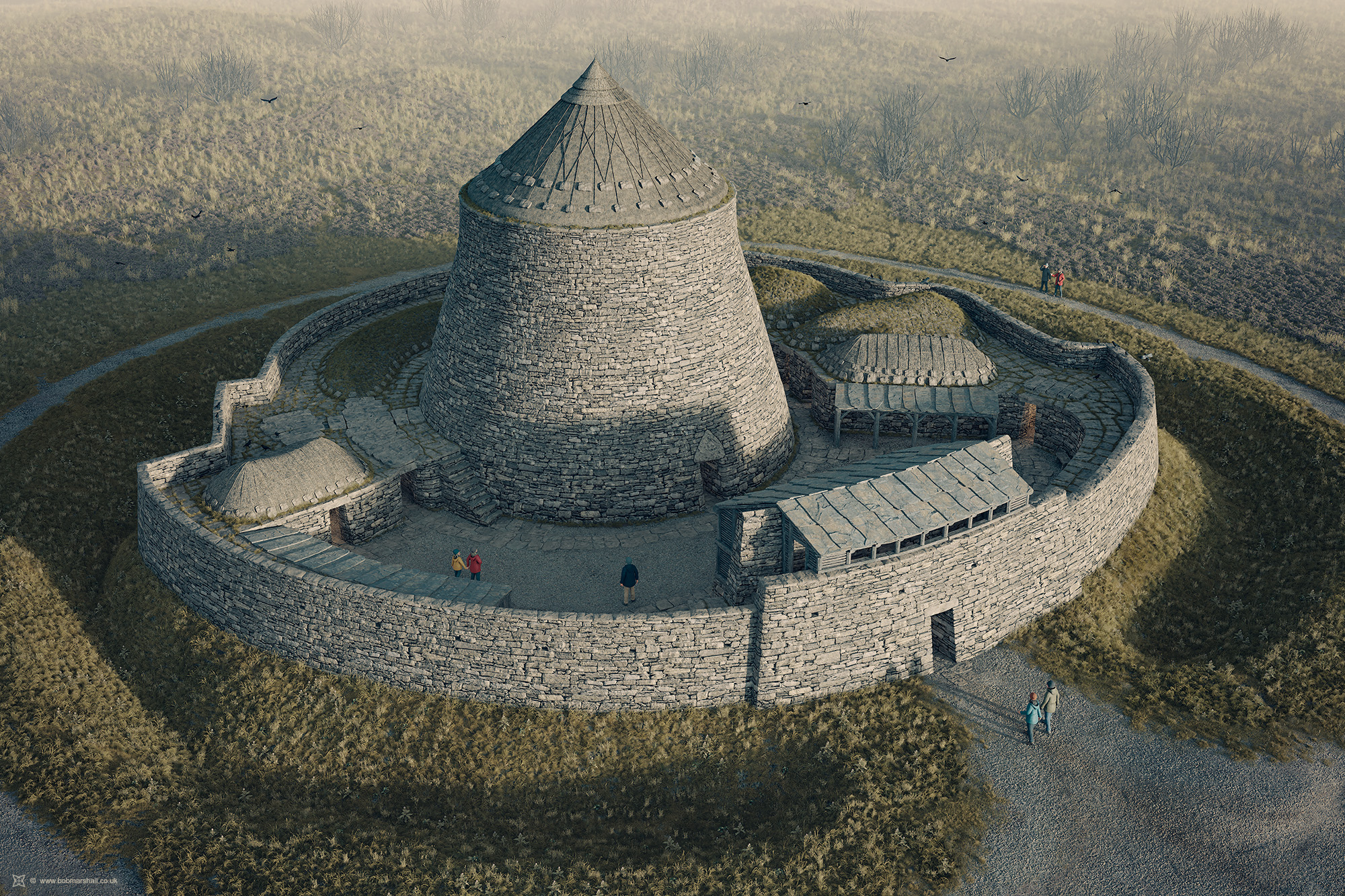 Archaeological charity Caithness Broch Project (CBP) has unveiled their impressive vision for the first broch to be built in Scotland in 2,000 years. Brochs – tall, double-walled, drystone towers found only in Scotland – were once common features in the Iron Age landscape across the Highlands and Islands, and Caithness can lay claim to have more brochs than anywhere else. CBP now want to recreate one as a thriving visitor attraction for the county. The visuals, created by digital reconstruction artist Bob Marshall, showcase the ambitious aims of the charity, who seek to construct the monument using tools and techniques only available to their Iron Age counterparts. The broch, designed by CBP co-founder Iain Maclean, reflects the wider architectural repertoire of brochs across Scotland, incorporates a number of flourishes such as triangular doorway lintels, cells built into the broch itself, and a series of outbuildings such as wags, wheelhouses and blockhouses.