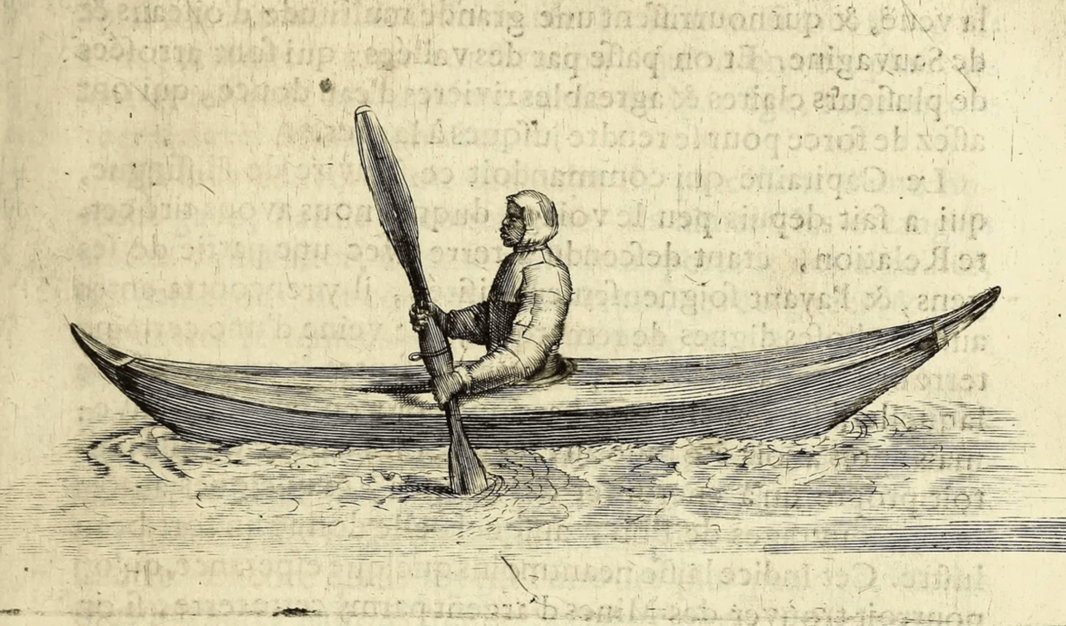 An indigenous kayaker in the David Strait of North America, strongly resembling descriptions of the Fin-Men seen in northern Scotland. From Charles de Rochefort’s ‘Histoire naturelle et morale des’.