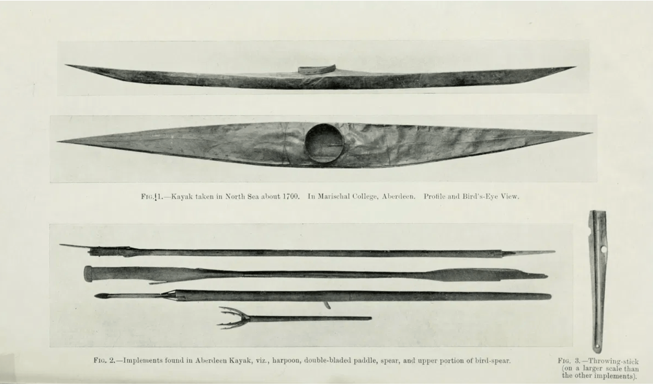 Images of a kayak and implements allegedly washed up in northeats Scotland, from David Ritchie’s 1912 article ‘Kayaks of the North Sea’.